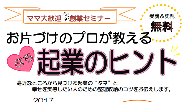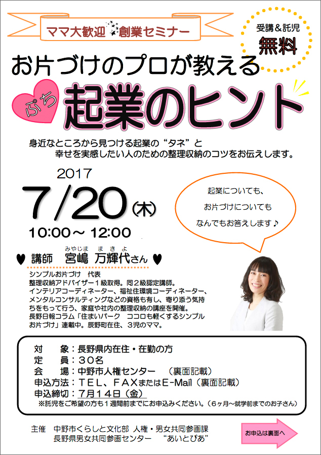 長野県中野市共催セミナー『ママのための創業セミナー お片づけのプロが教える企業のヒント』が7月20日(木)に開催されます。
